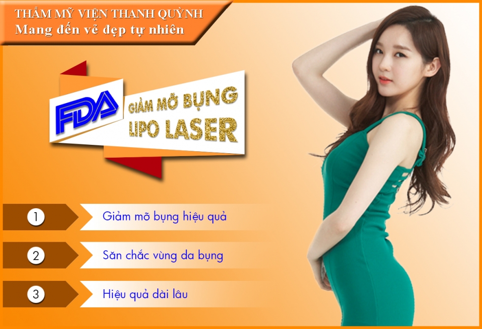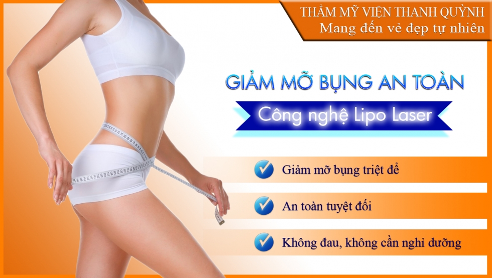 Một nghiên cứu mới đây của các nhà khoa học Mỹ cho thấy, có đến 87% người thực hiện giảm mỡ bụng bị thất bại ngay từ lần đầu tiên bởi sử dụng những phương pháp, cách giảm mỡ không phù hợp, hay do bản thân khó thích ứng với những bài tập công phu, tốn nhiều thời gian hoặc chế độ ăn kiêng hà khắc. Với sự tiến bộ của công nghệ thẩm mỹ, nhiều phương pháp ra đời giúp bạn có thể nhanh chóng có được vóc dáng mơ ước mà không phải vất vả ăn kiêng hay tập luyện. Lipo Laser có tốt không Được các chuyên gia tại Hoa Kỳ xem là liệu pháp hỗ trợ điều trị thừa cân, béo phì an toàn nhất giúp khắc phục tất cả các trường hợp béo bụng, mỡ thừa lâu năm, Laser Lipo hiện trở thành công nghệ giảm mỡ bụng không phẫu thuật số 1 thế giới với nhiều ưu điểm vượt trội. Tại Việt Nam, công nghệ giảm mỡ bụng Laser Lipo hiện đang được Thẩm mỹ viện Thanh Quỳnh ứng dụng thành công mang lại cho mọi khách hàng vòng eo thon gọn, săn chắc chỉ sau 1 liệu trình điều trị. Với lipo laser bạn có thể giảm béo bụng an toàn không phẫu thuật, không hút mỡ bụng và không tiềm tàn những rủi ro nguy hại. Giảm béo bụng Nguyên lý giảm mỡ của công nghệ Lipo Laser Cơ thể chúng ta có 2 loại mỡ cơ bản. Lớp mỡ thông thường dưới da khá lỏng lẻo, dễ tăng lên hay giảm đi theo chế độ dinh dưỡng và vận động. Khi tuân thủ chế độ ăn kiêng hay tập thể dục khoa học, lớp mỡ này sẽ dần bị tiêu hủy và đào thải. Loại mỡ thứ hai nằm tách biệt ở lớp trung bì, được bảo vệ chắc chắn bởi vỏ bọc toxin (độc tố), tạo thành những mô mỡ cứng, rắn chắc và khó hóa lỏng. Người ta thường gọi hiện tượng này là tích tụ mỡ thừa(Cellulite), tập trung ở vùng bụng dưới, mông dưới, đùi, bắp tay không thể mất đi theo cách thông thường như tập thể dục và ăn kiêng. Giảm mỡ bụng Là thế hệ giảm mỡ bụng bằng laser mới nhất hiện nay, phương pháp giảm mỡ bụng Laser Lipo sử dụng sóng Laser làm lỏng lẻo liên kết giữa các tế bào mỡ thông thường, làm rạn nứt các tổ chức Cellulite rắn chắc phá vỡ màng tế bào mỡ, hóa lỏng mô mỡ, giải phóng tối đa các tổ chức mỡ tích tụ dưới da, sau đó mỡ thừa được đưa ra ngoài qua sự bài tiết tự nhiên của cơ thể vì vậy lipo laser được xem là công nghệ giảm béo an toàn nhất so với các phương pháp hút mỡ bụng thông thường. Bước sóng 980nm tiếp tục đi vào sâu trong tổ chức dưới da tiến hành sắp xếp lại các collagen bị đứt gãy, đồng tạo hiệu ứng săn chắc da tại vùng điều trị. Do vậy, sau khi giảm mỡ bụng bằng công nghệ Lipo Laser vùng da điều trị cũng trở nên săn chắc hơn, không chảy xệ, mỡ không tái phát. Giảm béo không phấu thuật Giảm béo bụng bằng công nghệ Lipo Laser – Sự lựa chọn số 1 dành cho bạn Giảm mỡ bụng triệt để tạo dáng cơ thể hoàn hảo Dưới tác động của sóng laser sẽ giúp hóa lỏng lượng mỡ thừa, phá vỡ hoàn toàn các tế bào mỡ, làm nứt các tổ chức cellulite và giúp giải phóng tối đa các tổ chức mỡ tích tụ dưới da, giúp loại bỏ mỡ thừa một cách triệt để tạo dáng cơ thể hoàn hảo An toàn tuyệt đối Điều khiến khách hàng ưa thích nhất ở công nghệ Lipo Laser là không xấm lấn cơ thể, không trích rạch và tiềm tàng rủi ro như các phương pháp hút mỡ bụng trước đây, mỡ thừa sau khi được hóa lỏng sẽ được đưa ra ngoài theo cơ chế bài tiết tự nhiên của cơ thể và tuyệt đối an toàn. Công nghệ giảm béo Cavi Lipo Hạn chế xâm lấn và không có biến chứng Lipo Laser hoạt động theo nguyên lý tự điều chỉnh bước sóng và tác động trực tiếp vào vùng lấy mỡ, phân hủy và hóa lỏng mỡ để đưa ra ngoài mà tuyệt đối không ảnh hưởng đến các mô xung quanh, mạch máu hay dây thần kinh. Vì vậy, giảm mỡ bụng bằng phương pháp này hạn chế xâm lấn, không gây biến chứng. Không đau, không mất thời gian nghỉ dưỡng Với giảm mỡ bụng bằng Lipo Laser, bạn không cần mất thời gian nghỉ dưỡng mà có thể sinh hoạt cũng như làm việc bình thường ngay trong liệu trình điều trị. Giảm béo bụng bằng Lipo Laser cũng không đau đớn, khách hàng cảm thấy dễ chịu trong suốt quá trình điều trị. Làm săn chắc da Lipo Laser không chỉ giảm mỡ bụng hiệu quả mà năng lượng laser còn đi sâu vào trong da sắp xếp lại các tổ chức collagen bị đứt gãy làm săn chắc cơ thể tạo vóc dáng thon gọn Không có rủi ro Với mức độ an toàn được đánh giá cao nhất hiện nay và thực hiện dưới bàn tay của các chuyên gia giàu kinh nghiệm, chưa có 1 khách hàng điều trị giảm béo nào tại Thanh Quỳnh gặp rủi ro sức khỏe khi sử dụng phương pháp giảm béo an toàn này. Quy trình giảm mỡ bụng công nghệ Lipo Laser tại Thanh Quỳnh Bước 1: Thăm khám và tư vấn Trước khi thực hiện phương pháp Lipo Laser, khách hàng được các bác sĩ đo đạc, kiểm tra vùng mỡ thừa, từ đó chỉ định phương pháp cũng như kế hoạch giảm mỡ p