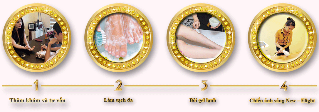 Bôi gel lạnh lên vùng da cần triệt lông Sau khi làm sạch vùng da chân cần triệt, bạn sẽ được đội ngũ chuyên viên bôi một lớp gel trong suốt, mát dịu lên da. Lớp gel sẽ bảo vệ làn da của bạn nên bạn sẽ luôn cảm thấy thoải mái mà không hề cảm thấy đau rát khi triệt lông. Chiếu ánh sáng New – Elight để tẩy lông Từ những đánh giá tình trạng nang lông ở bước 1. Chuyên viên sẽ tiến hành điều chỉnh tần số ánh sáng cho phù hợp với tình trạng lông ở chân và chiếu trực tiếp lên da. Năng lượng ánh sáng sinh học sẽ chiếu từ từ, lần lượt đến hết vùng da để thẩm thấu và triệt tận gốc từng chân lông.